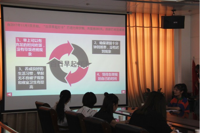 本次会议紧紧围绕品牌建设的主题,由田书记开头致词后,辅导员们开始依次用PPT展示自己品牌建设子计划的实施情况及本学期的工作总结。随后各位领导一一进行了点评,对大家的汇报情况予以肯定并发表自己的见解,提出了建议,建议结合学院优质校建设和“诊改”要求,下一步把品牌建设和学院“目标导航工程”相结合,进一步把品牌建设的成果进行转化。
